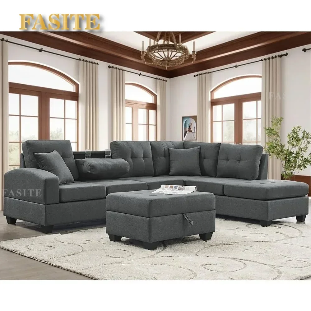 L Shape Modular Storage Ottoman & Chaise, Comfy Oversized Corner Sofa Cup Holder,Fabric Living Room Furniture Couch Sets